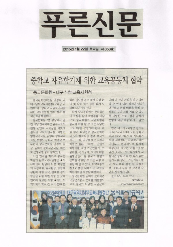2015.1.22 푸른신문) 중학교 자유학기제 위한 교육공동체 협약 중국문화원-대구 남부교육지원청 페이지 정보 작성자 중국문화원 작성일15-05-08 10:49 조회3,195회 댓글0건 이전글 다음글 본문 . 댓글목록 등록된 댓글이 없습니다. 이전글 다음글