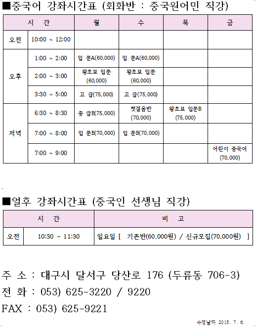2015년 7월 중국어 & 얼후 강좌 시간표 페이지 정보 작성자 중국문화원 작성일15-07-06 17:39 조회7,697회 이전글 다음글 본문 기존의 토요 입문반은 폐강되었습니다. 토요 입문반 청강을 원하시는 분은 저희 문화원으로 연락주세요. 3인 이상 모집될 경우 반을 개설할 예정입니다. 이전글 다음글